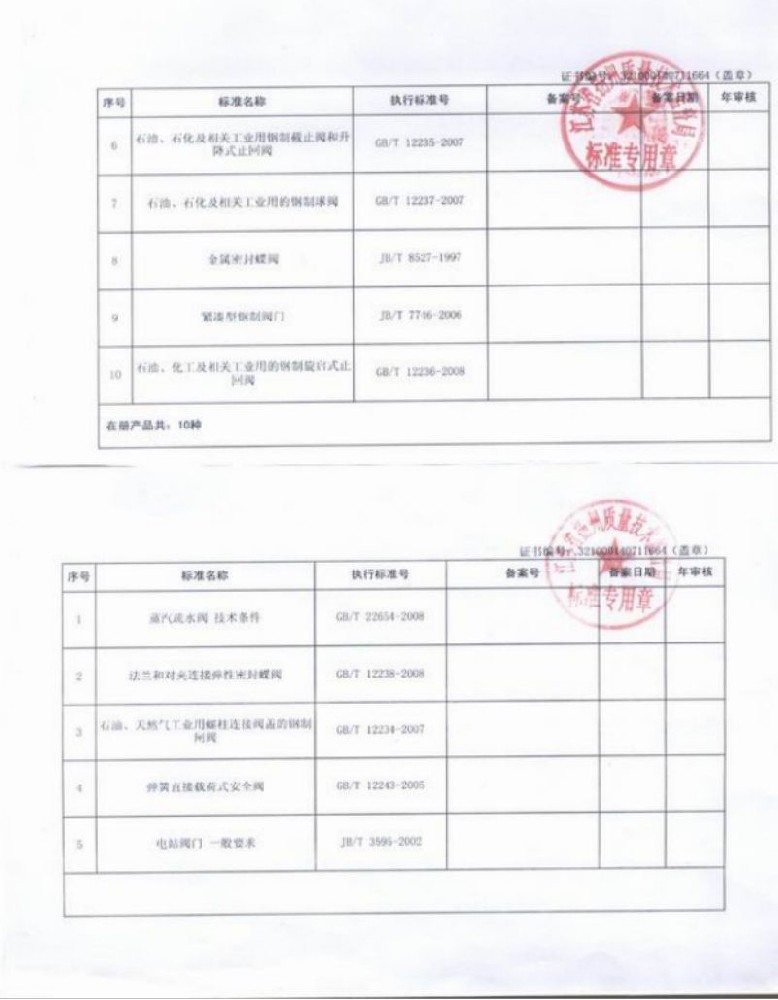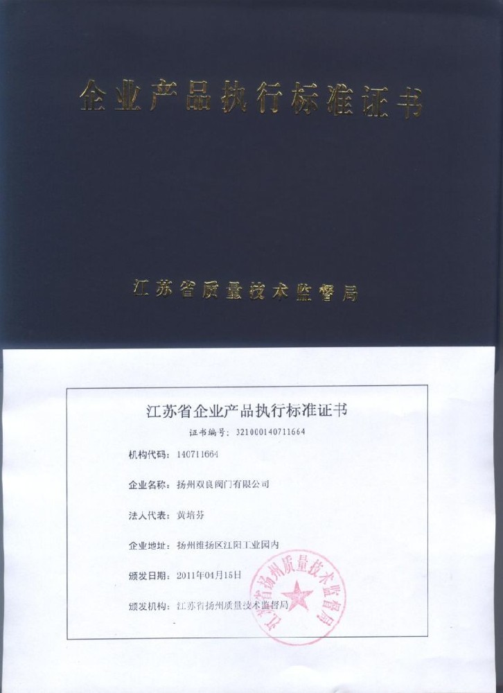 産品執(zhí)行标準(zhǔn)證書