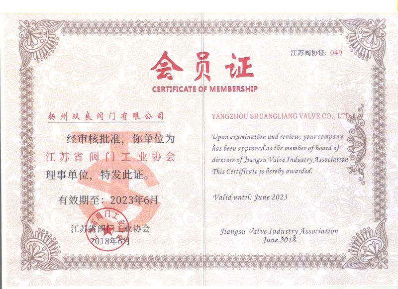 江蘇省(shěng)閥門協會理(lǐ)事單位證書(shu)