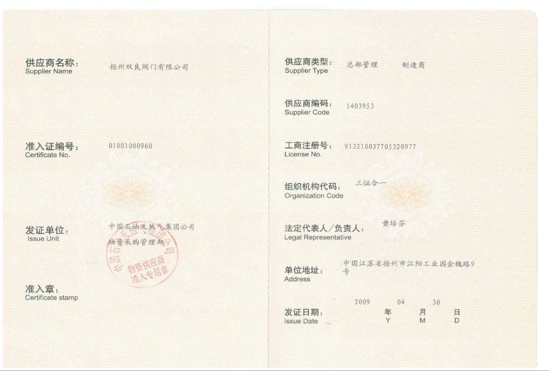 中石(shí)油物資供應(ying)商準入證書(shū)